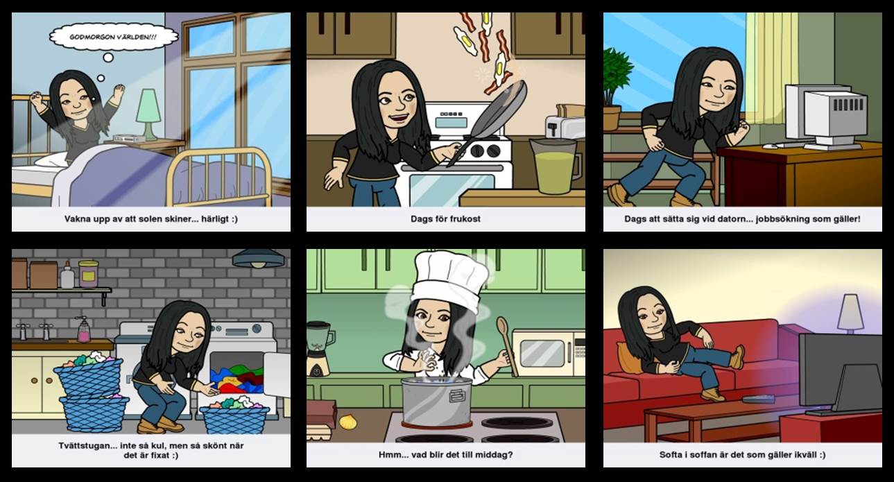 Har hittat en så rolig app via Facebook som heter ”bitstrips”, där man gör en avatar av sig själv och sedan är det bara att leta efter ett scenario som man vill använda, personifiera och sen delar man den bilden på Facebook. Här är ett kollage av scenarier som jag gjort… som visar en helt vanlig dag;)